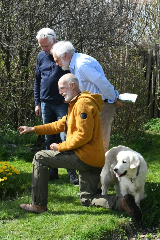 Dan gaan we met zijn allen de tuin in. De tuin heeft een weids uitzicht over de weilanden. Overal wijst Ed planten aan die inheems zijn en echt van Texel komen. De honden en ook zijn kleindochter lopen gezellig mee. We wandelen langs een kas met stekjes. De bordjes bij de plantjes vertellen waar Ed het plantje vandaan heeft op het eiland.