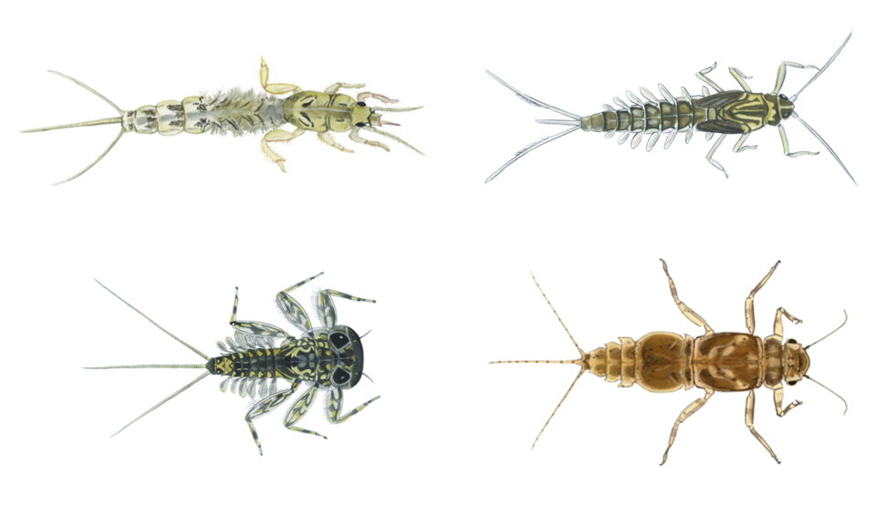 Vier groepen eendagsvlieglarven